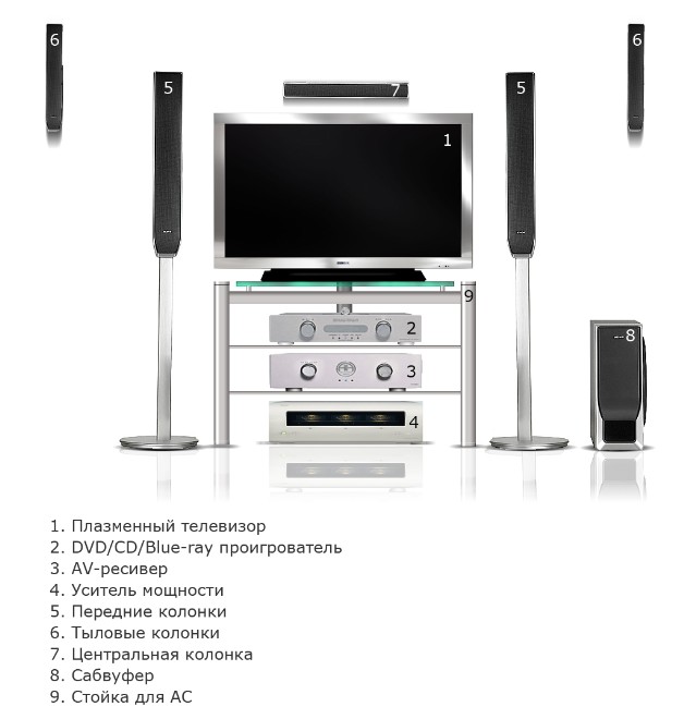 Комплектующие и порядок расстановки домашнего кинотеатра.